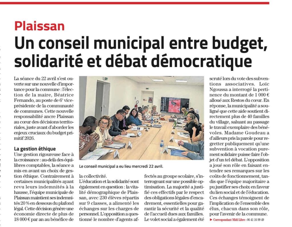 Revue de presse Midilibre du 27-04-2026 Un conseil municipal entre budget, solidarité et débat démocratique. Heures 28/04/2026 Partager : Partager sur Facebook(ouvre dans une nouvelle fenêtre) Facebook Partager sur X(ouvre dans une nouvelle fenêtre) X Articles similaires